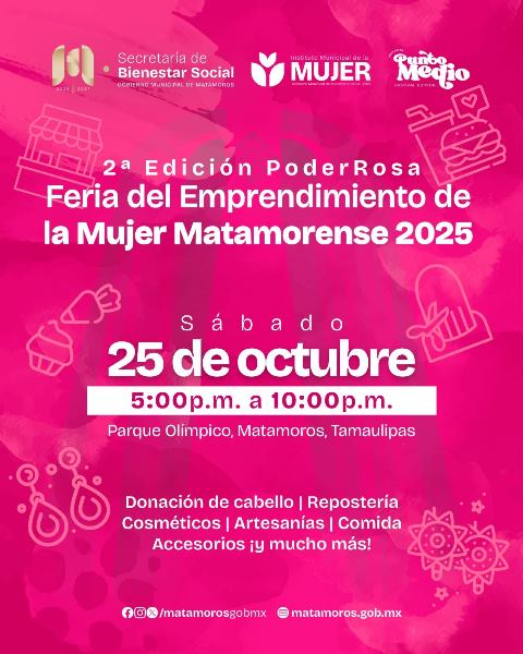 Matamoros, Tam.- El Gobierno de Beto Granados invita a todas las familias matamorenses a participar en la Feria del Emprendimiento de la Mujer Matamorense 2025 “PoderRosa”, que se llevará a cabo este sábado 25 de octubre en el Parque Olímpico. Este evento busca reconocer y fortalecer el papel de las mujeres emprendedoras, quienes con su creatividad y esfuerzo contribuyen al Renacimiento de Matamoros y al impulso de la economía local.