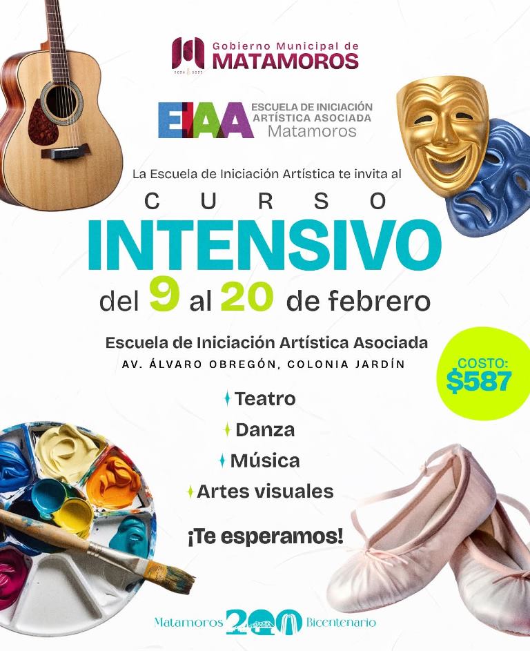 Matamoros, Tam.- El Gobierno de Beto Granados invita a la ciudadanía a participar en el curso intensivo de artes que se llevará a cabo del 9 al 20 de febrero en la Escuela de Iniciación Artística Asociada, donde se integran disciplinas como teatro, danza, música y artes visuales en un mismo espacio de formación.