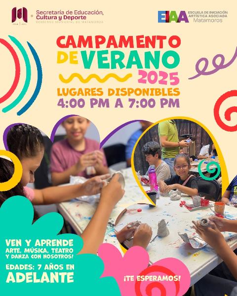 H. Matamoros, Tamaulipas.- El Gobierno Municipal de Matamoros, encabezado por Beto Granados, a través de la Secretaría de Educación, Cultura y Deporte, hace una cordial invitación a niñas, niños y adolescentes a participar en el Campamento de Verano 2025, organizado por la Escuela de Iniciación Artística Asociada. Esta iniciativa busca ofrecer a las infancias y juventudes una experiencia única llena de creatividad, diversión y aprendizaje.