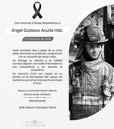 Matamoros, Tam.- El alcalde de Matamoros, Beto Granados, expresó su más profundo pesar por el fallecimiento del joven bombero Ángel Gustavo Acuña Hernández, ocurrido este 23 de enero de 2026, lamentando una pérdida que enluta no solo a su familia, sino a toda la comunidad y al Heroico Cuerpo de Bomberos. Con inmensa tristeza, el edil reconoció que se va un servidor público que, pese a su corta edad, demostró un compromiso ejemplar con la noble vocación de salvar vidas.