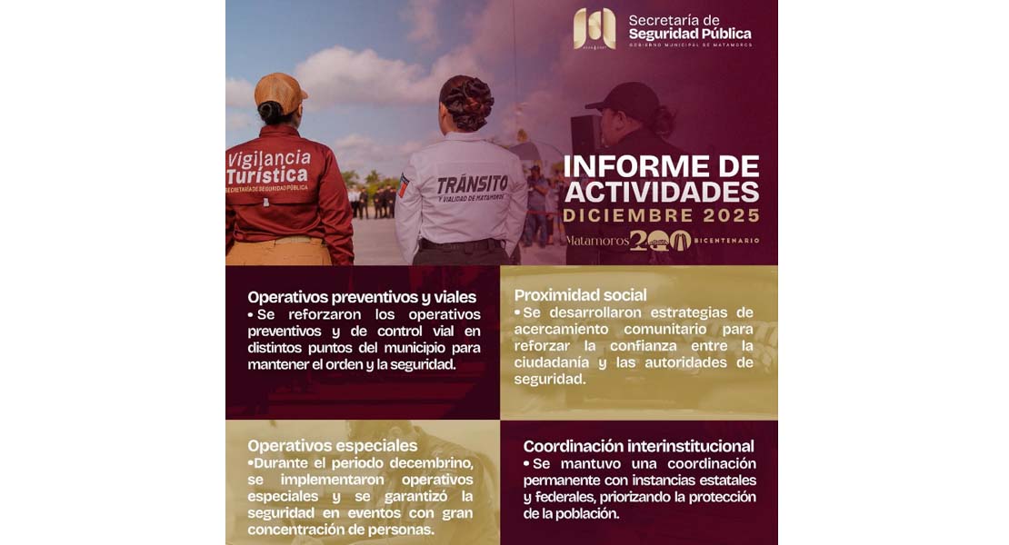 Con estas acciones, el Gobierno de Beto Granados refrenda su compromiso de trabajar de manera constante por la seguridad y tranquilidad de las y los matamorenses, demostrando que Matamoros avanza con estrategias firmes y coordinadas en beneficio de toda la comunidad.
