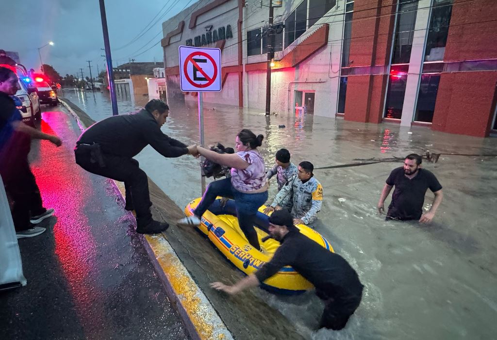 Reynosa, Tamaulipas.- Personal de proximidad y de Tránsito Estatal de la Guardia Estatal, mantiene un operativo permanente en apoyo a las personas vulnerables por las inundaciones registradas esta tarde en Reynosa.