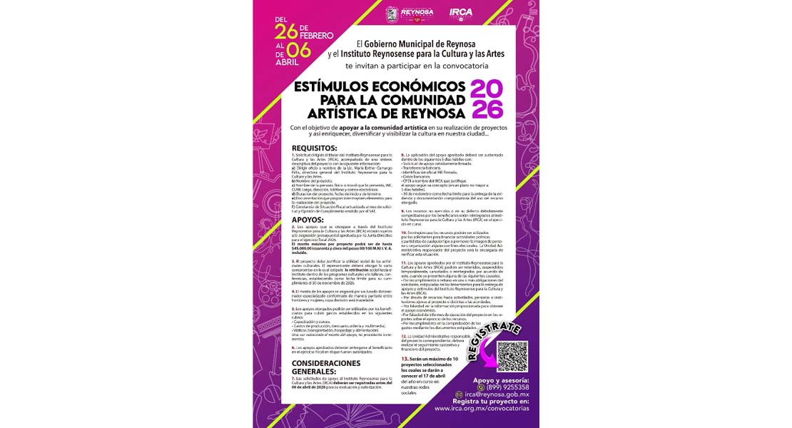Para asesoría en el proceso de registro, el IRCA pone a disposición el teléfono 899 925 5358 y el correo electrónico irca@reynosa.gob.mx.