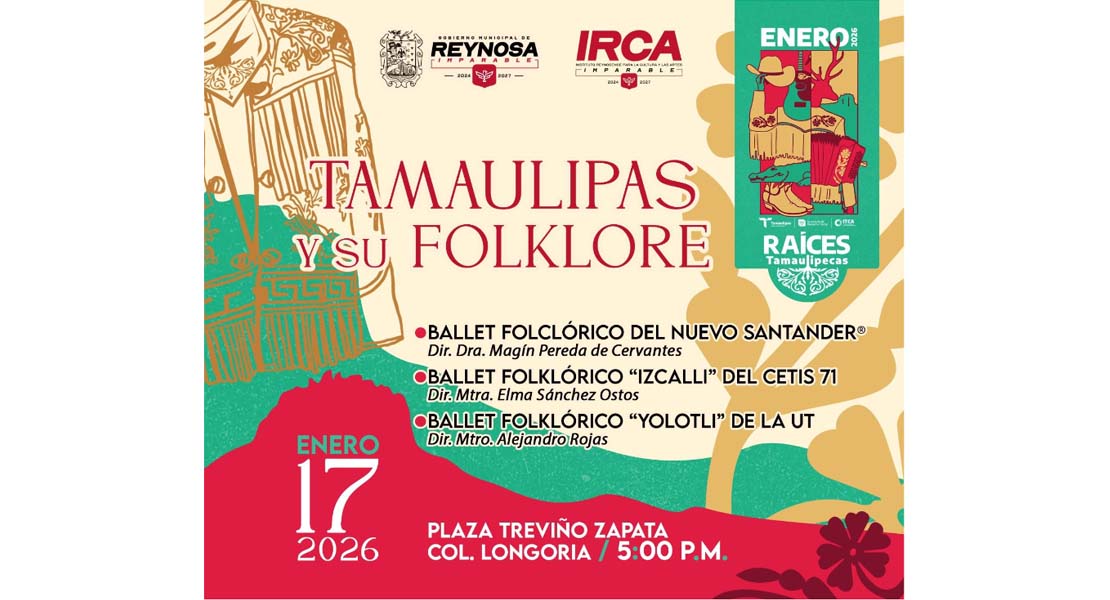 Reynosa, Tam.- Siguiendo las instrucciones del Alcalde Carlos Peña Ortiz, el Instituto Reynosense para la Cultura y las Artes invita a disfrutar este 17 de enero de “Tamaulipas y su Folklore”, evento que reunirá grupos de danza en la plaza Treviño Zapata a las 5:00 P. M.