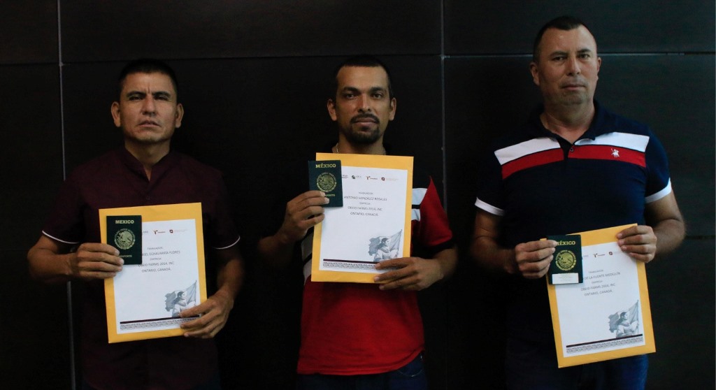 En un acto encabezado por el secretario del Trabajo, Luis Gerardo Illoldi Reyes, acompañado por la subsecretaria de Empleo y Previsión Social, Carolina Iveth Martínez Molano, se hizo entrega de tres sobres de viaje a trabajadores tamaulipecos del giro agrícola que fueron contratados formalmente por la empresa canadiense OBEID Farms 2014, INC. para laborar durante un periodo de 24 meses.