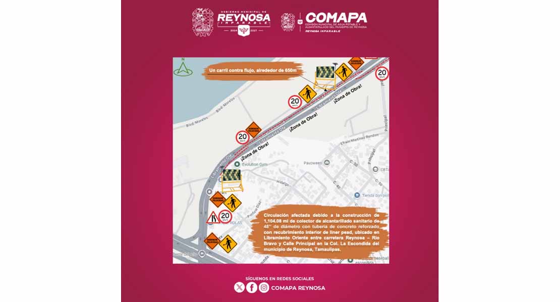 Como parte de estas maniobras, un tramo de aproximadamente 650 metros de la vialidad se encuentra en contraflujo. Por ello, se recomienda a los automovilistas que tomen precauciones y consideren rutas alternas para evitar demoras. COMAPA Reynosa agradece la comprensión de la ciudadanía, reiterando su compromiso de mejorar la infraestructura sanitaria para un mejor servicio a la comunidad.