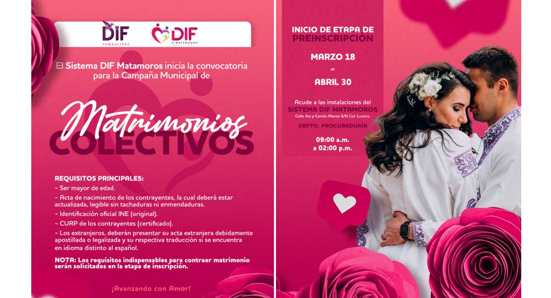 Matamoros, Tam.- El Sistema DIF Matamoros que encabeza la Lic. Ana Ariceaga de Granados, abre la convocatoria para invitar a todas las parejas interesadas en contraer nupcias, a formar parte de la Campaña Municipal de “Matrimonios Colectivos”.