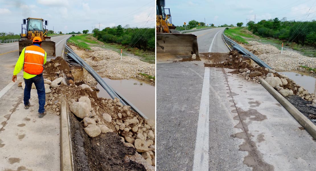 Ciudad Madero, Tamaulipas.- Apenas se reportaron los daños en los tramos carreteros a causa de las lluvias, la Secretaría de Obras Públicas del Estado en coordinación con la Secretaría de Infraestructura, Comunicaciones y Transportes del Gobierno Federal inició de inmediato los trabajos y movilizó maquinaria pesada, personal y materiales para reparar las afectaciones.