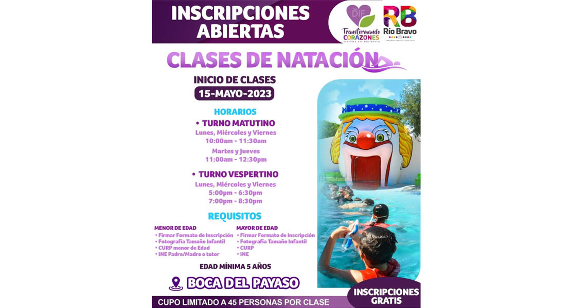 Río Bravo, Tam.- El Sistema DIF Río Bravo que preside la Sra. Malena Rodela de Villegas, te invita a inscribirte a las clases de natación que se estarán llevando a cabo en las instalaciones del parque Boca del Payaso a partir de este lunes 15 de mayo.