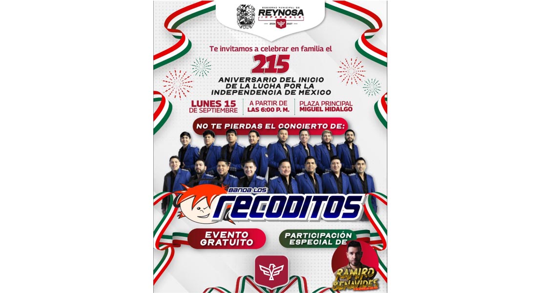 Reynosa, Tam.- El Presidente Municipal, Carlos Peña Ortiz, invita a todos los reynosenses a participar en la ceremonia del 215 Aniversario de Inicio de la la Lucha por la Independencia de México, que se festeja el próximo lunes 15 de septiembre, con la presentación de la Banda Los Recoditos.
