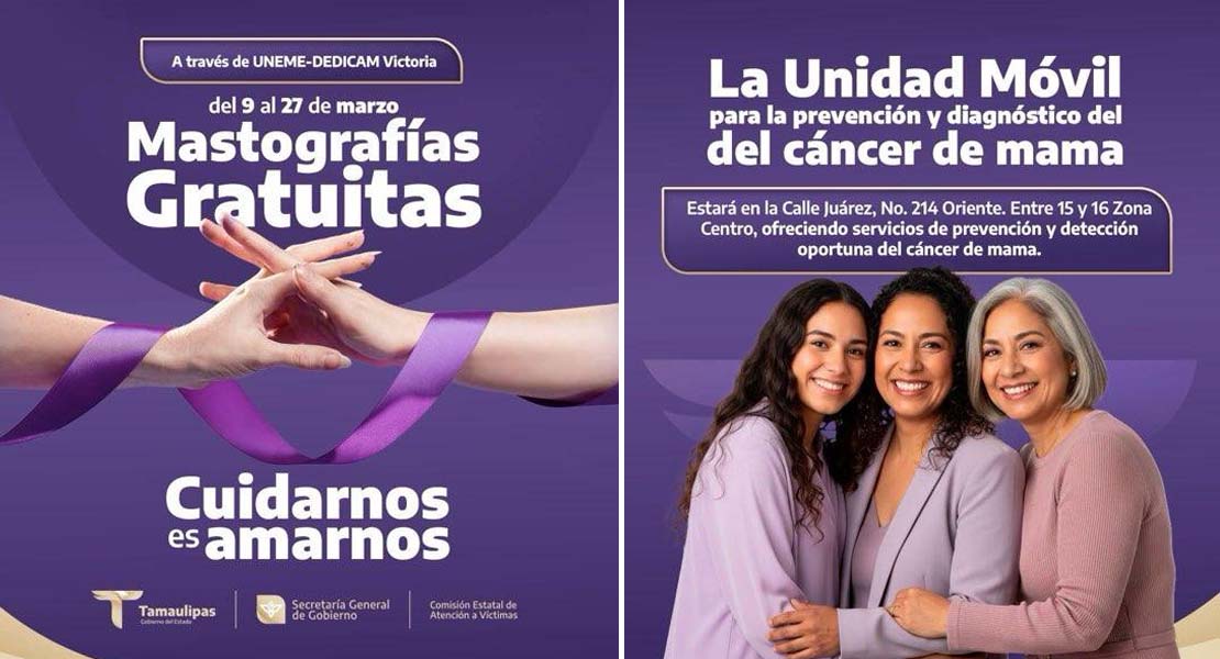 Ciudad Victoria, Tamaulipas.- La Comisión Estatal de Atención a Víctimas de Tamaulipas (CEAV Tamaulipas), mediante la unidad móvil de la UNEME-DEDICAM Victoria, convoca a la población a sumarse a la Jornada de Mastografías Gratuitas, que se realizará del 9 al 13 de marzo, en un horario de 9:00 a 15:00 horas, en sus oficinas centrales ubicadas en Calle Benito Juárez 214, Zona Centro, en Ciudad Victoria, Tamaulipas.