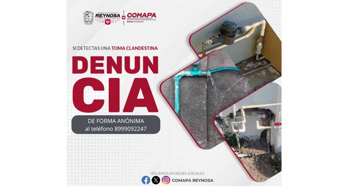 Reynosa, Tam.- La Comisión Municipal de Agua Potable y Alcantarillado de Reynosa exhorta a la ciudadanía a denunciar cualquier toma clandestina que detecten en sus sectores, ya que este tipo de conexiones irregulares afectan directamente la presión y el suministro del vital líquido, provocando un servicio deficiente en distintas colonias.