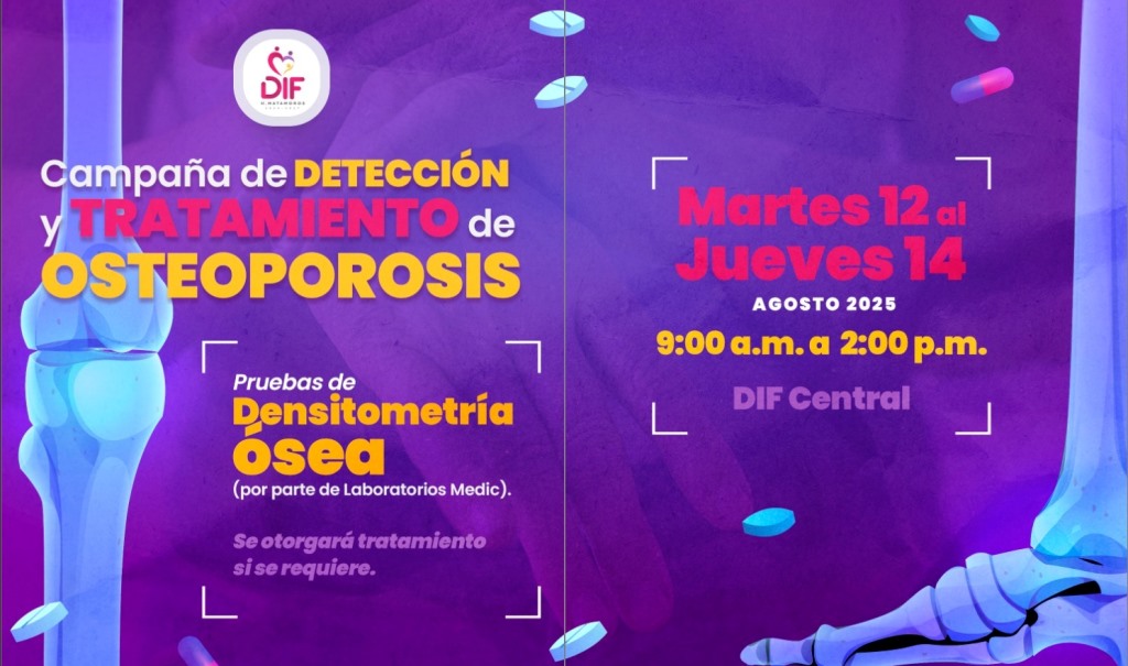 Matamoros, Tam.- Dando continuidad a las acciones que promueven la detección y prevención de enfermedades, el Sistema DIF Matamoros a través del Departamento de Salud y en colaboración con Laboratorios Medic, invitan a la población a sumarse a la Campaña de Detección y Tratamiento de Osteoporosis.
