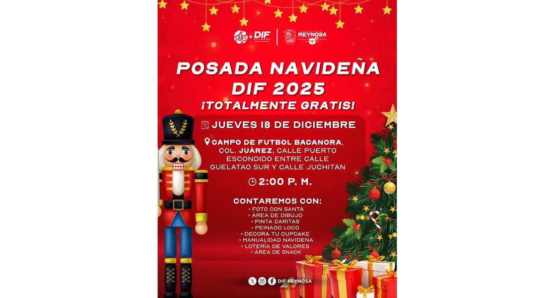 Reynosa, Tam.- El Alcalde, Carlos Peña Ortiz, a través del Sistema DIF-Reynosa, que preside Carlos Luis Peña Garza, llevará a cabo la Posada Navideña DIF 2025, una actividad totalmente gratuita que tiene como objetivo de llevar momentos de alegría a niñas y niños de la ciudad.
