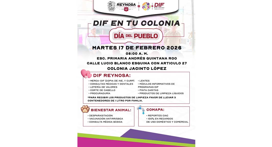 Reynosa, Tam.- El Sistema DIF-Reynosa que preside Carlos Luis Peña Garza, realizará la brigada “DIF en Tu Colonia”, con el propósito de acercar los diversos servicios gratuitos a las familias de la colonia Jacinto López.