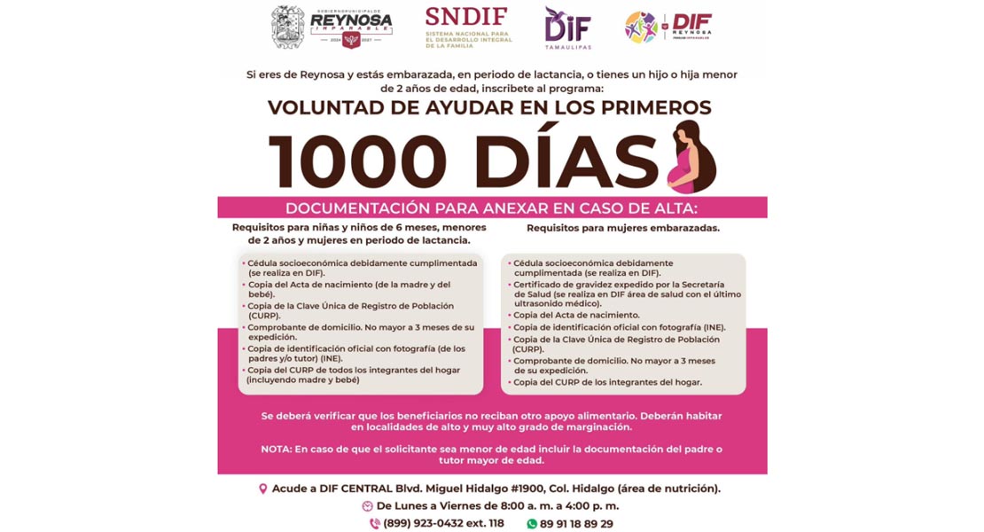 Reynosa, Tam.- El Sistema DIF-Reynosa que preside Carlos Luis Peña Garza, invita a las familias a sumarse al programa “Voluntad de Ayudar en los Primeros 1000 Días”, diseñado para apoyar a niñas y niños de 6 meses, menores de 2 años, y mujeres en periodo de lactancia.