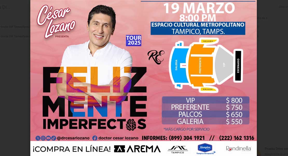 Ciudad Victoria, Tamaulipas.- El reconocido conferencista César Lozano estará presentándose en el sur de la entidad con su ponencia “Feliz Mente Imperfectos”, evento del que una parte de las ganancias obtenidas, serán destinadas a los diferentes programas asistenciales del Sistema DIF Tamaulipas que es presidido por la doctora María de Villarreal.