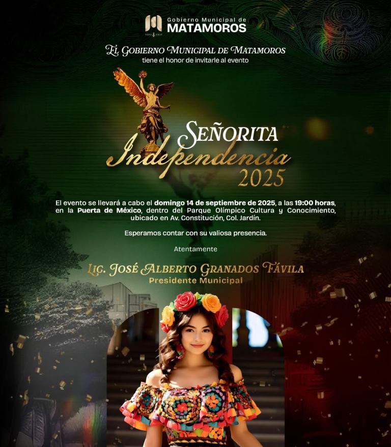 H. Matamoros, Tamaulipas.- El gobierno de Beto Granados extiende una cordial invitación a toda la comunidad para asistir al certamen Señorita Independencia 2025, un evento que promete ser una noche inolvidable llena de talento, cultura y orgullo mexicano. Esta celebración tiene como objetivo enaltecer nuestras raíces y reconocer el carisma y compromiso de las jóvenes matamorenses.