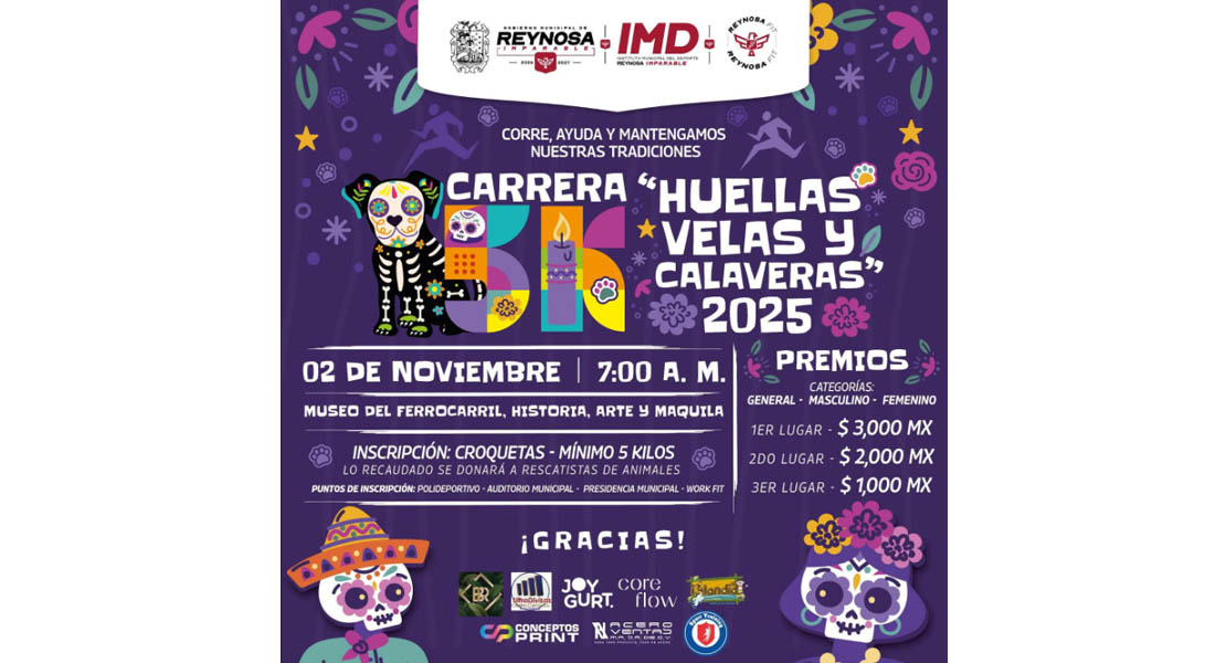Reynosa, Tam.- El Alcalde Carlos Peña Ortiz invita a la comunidad a participar en la Carrera 5K Huellas, Velas y Calaveras 2025, que se llevará a cabo el próximo 2 de noviembre.