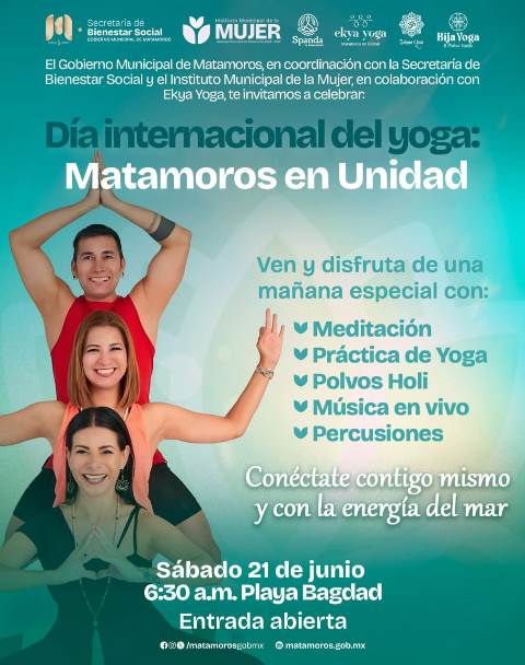 H. Matamoros, Tamaulipas.- El Gobierno Municipal, a través del Instituto Municipal de la Mujer, hace una cordial invitación a la ciudadanía para que este sábado 21 de junio se sume a la conmemoración del Día Internacional del Yoga en Playa Bagdad. El evento iniciará a las 6:30 a.m. con una jornada al aire libre enfocada en promover el equilibrio, la energía y el bienestar emocional.