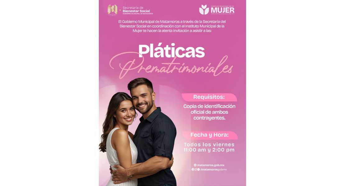 H. Matamoros, Tamaulipas.- El gobierno municipal de Matamoros, a través de la Secretaría del Bienestar y en coordinación con el Instituto Municipal de la Mujer, invita a las parejas que están por contraer matrimonio a participar en las pláticas prematrimoniales.