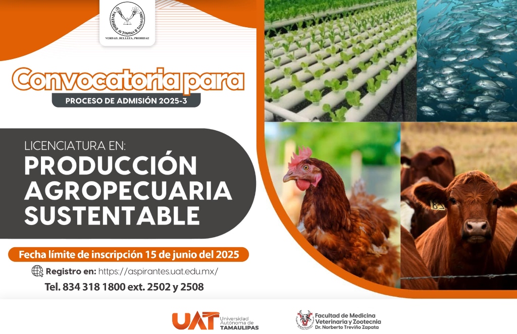 Ciudad Victoria, Tam.- La Universidad Autónoma de Tamaulipas (UAT) tiene abierto el proceso de inscripción para ingresar a la Licenciatura en Producción Agropecuaria Sustentable que imparte la Facultad de Medicina Veterinaria y Zootecnia (FMVZ).
