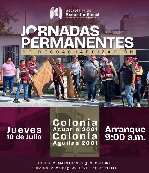 H. Matamoros, Tamaulipas.- Como parte del compromiso del Gobierno Municipal por fomentar entornos saludables, este jueves 10 de julio se llevará a cabo una nueva jornada de la Campaña permanente de descacharrización en las colonias Acuario 2001 y Águilas 2001, a partir de las 9:00 de la mañana, teniendo como punto de arranque la calle Maestro.