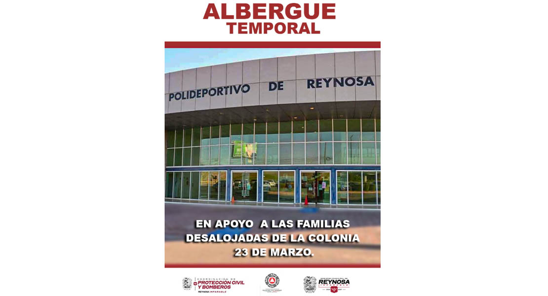 Reynosa, Tam.- Por indicaciones del Presidente Municipal Carlos Peña Ortiz, la Coordinación de Protección Civil y Bomberos habilitó como Albergue Emergente el Polideportivo Reynosa, para las familias que fueron desalojadas de la colonia 23 de Marzo.