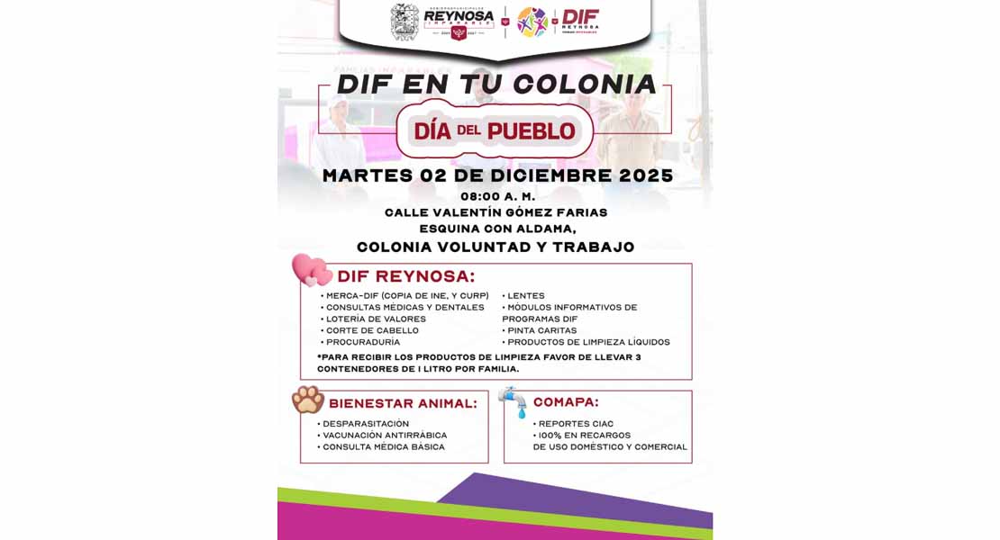 Reynosa, Tam.- Con el objetivo de acercar servicios y apoyos a las familias, el Sistema DIF-Reynosa que preside Carlos Luis Peña Garza, llevará a cabo la Brigada “DIF en Tu Colonia”, este martes 02 de diciembre, a partir de las 08:00 de la mañana en la calle Valentín Gómez Farías esquina con Aldama, en la colonia Voluntad y Trabajo.