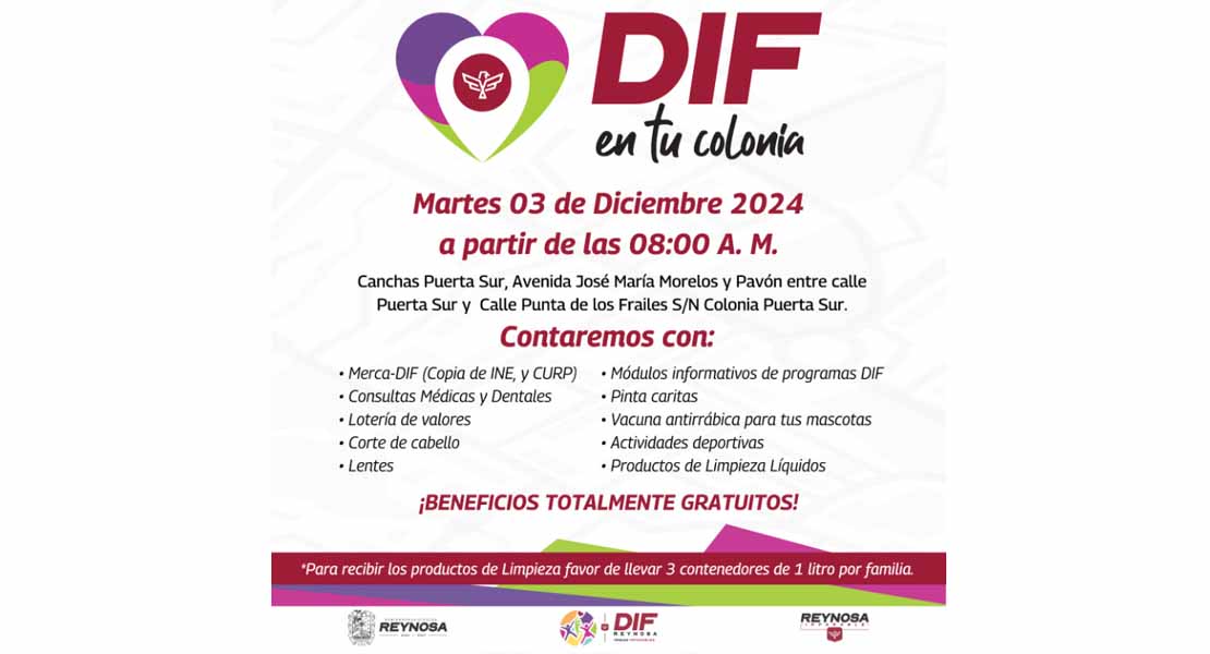 Reynosa, Tam.- El Sistema DIF Reynosa que preside Carlos Luis Peña Garza, llevará a cabo el programa “DIF en Tu Colonia”, el próximo martes 3 de diciembre en las canchas de la colonia Puerta Sur, ubicadas en Avenida José María Morelos y Pavón, entre calle Puerta Sur y calle Punta de los Frailes S/N, a partir de las 8:00 de la mañana.