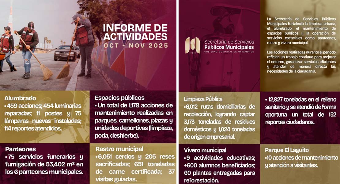 H. Matamoros, Tamaulipas.- Durante este periodo, la Secretaría de Servicios Públicos Municipales, en coordinación con el alcalde de Matamoros Beto Granados, realizó acciones continuas para fortalecer la limpieza urbana, el mantenimiento de espacios públicos y la operación eficiente de los servicios esenciales en la ciudad.