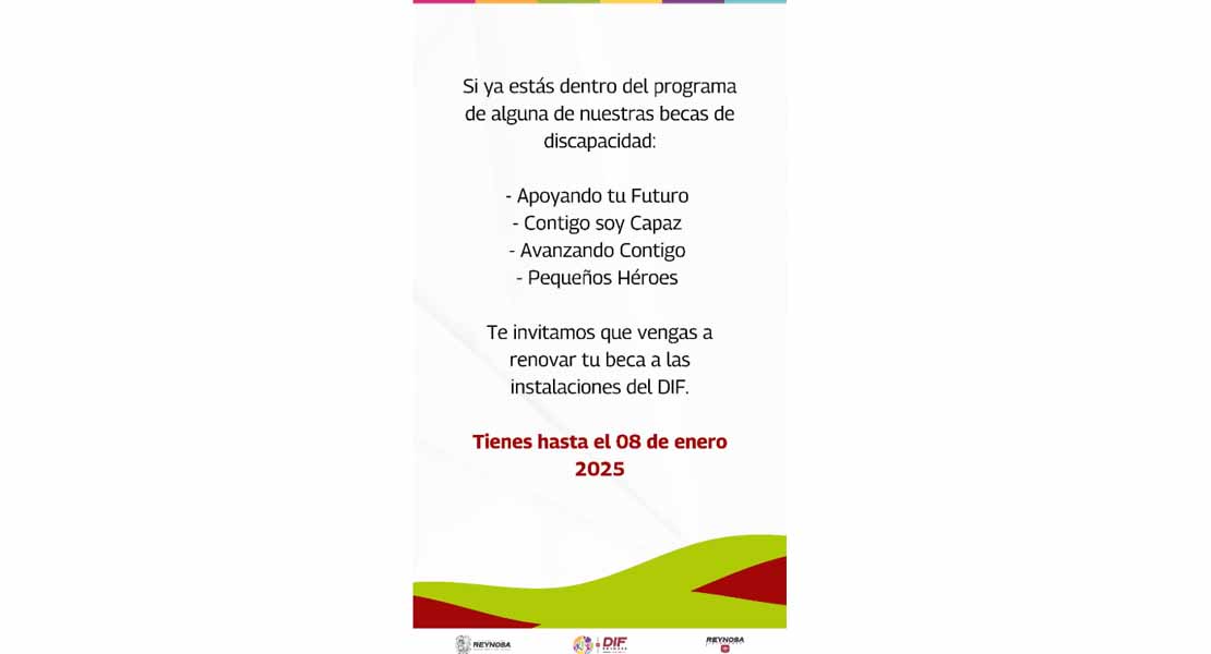 Reynosa, Tam.- El Sistema DIF Reynosa, que preside Carlos Luis Peña Garza, llama a acudir a renovar las becas “Contigo Soy Capaz”, “Apoyado Tu Futuro”, “Pequeños Héroes” y “Avanzando Contigo”.