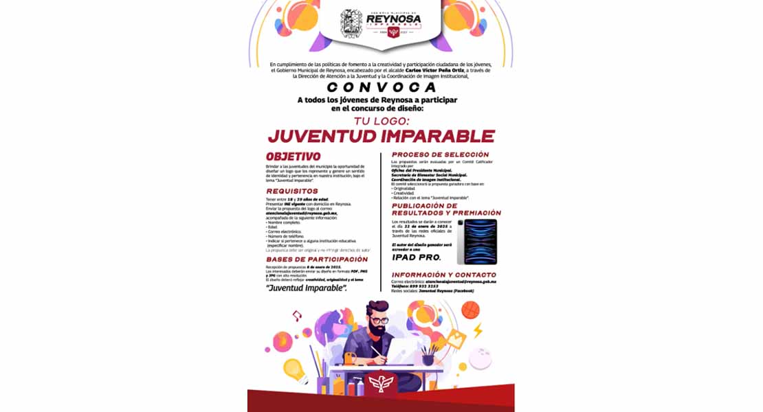 Reynosa, Tam.- El Presidente Municipal Carlos Peña Ortiz convoca a los jóvenes de 18 a 29 años, que vivan en esta ciudad, a participar en el concurso de diseño gráfico, Tu Logo “Juventud Imparable”, un ícono que genere y represente su sentido de identidad.