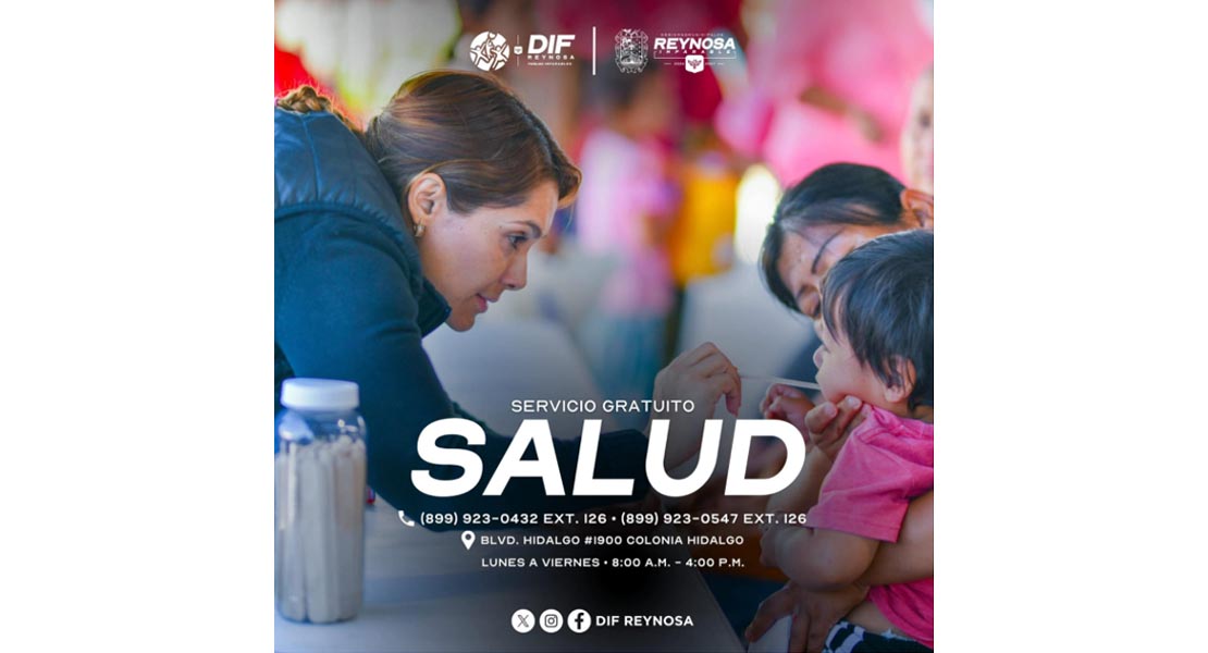 Reynosa, Tam.- Como parte de su compromiso con la salud, el Sistema DIF-Reynosa que preside Carlos Luis Peña Garza, brinda servicios médicos totalmente gratuitos a la comunidad, a través del área de salud ubicada en las instalaciones del organismo asistencial, en Bulevar Hidalgo número 1900, en la colonia Hidalgo.
