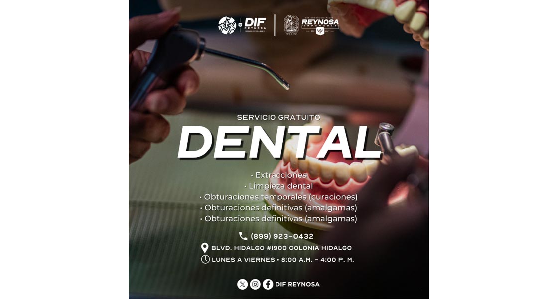 Reynosa, Tam.- El Sistema para el Desarrollo Integral de la Familia de Reynosa, DIF, que preside Carlos Luis Peña Garza, brinda atención dental gratuita con extracciones dentales, limpiezas, obturaciones temporales y obturaciones definitivas con amalgamas, con el objetivo de mejorar la salud bucal de los reynosenses.