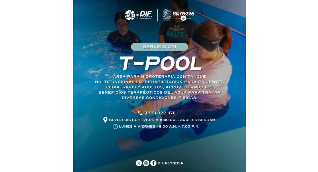 Reynosa, Tam.- El Sistema DIF-Reynosa que preside Carlos Luis Peña Garza, ofrece a la ciudadanía el servicio T-Pool en el Centro de Rehabilitación Integral, un espacio especializado destinado a la hidroterapia con tanque multifuncional, diseñado para la atención de pacientes pediátricos y adultos que requieren rehabilitación física.