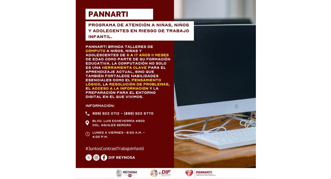 Reynosa, Tam.- El Sistema DIF-Reynosa, que encabeza Carlos Luis Peña Garza, continúa fortaleciendo el acceso a la educación de niñas, niños y adolescentes en riesgo de trabajo infantil, a través del programa PANNARTI, con el taller de cómputo.