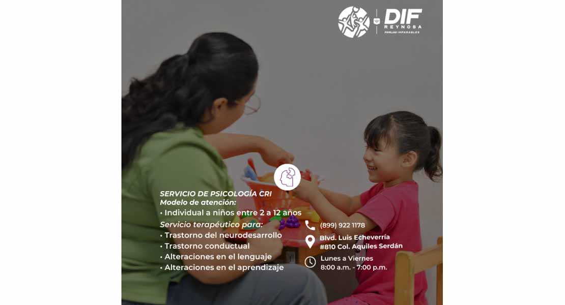 Reynosa, Tam.- Comprometido con el desarrollo integral de la niñez, a través del Centro de Rehabilitación Integral (CRI), el Sistema DIF Reynosa, que preside Carlos Luis Peña Garza, ofrece el servicio de psicología para menores de edad.