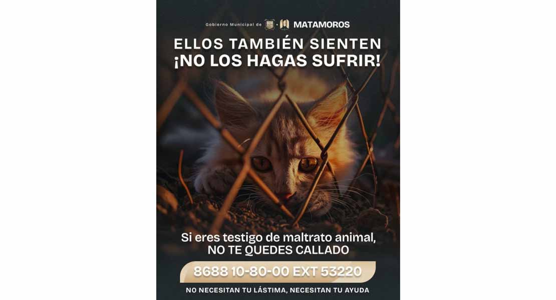 H. Matamoros, Tamaulipas.- El presidente municipal de Matamoros, Beto Granados, hizo un llamado enérgico a la ciudadanía para denunciar cualquier caso de maltrato animal, enfatizando que esta práctica no es un simple descuido, sino un acto de crueldad que no debe ser tolerado.