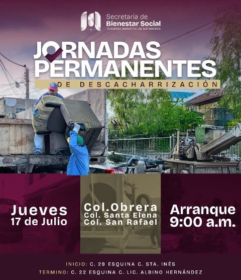 H. Matamoros, Tamaulipas.- El Gobierno Municipal de Matamoros, a través de la Dirección de Salud Pública y en coordinación con Servicios públicos, continúa implementando acciones firmes para mejorar las condiciones de salud e higiene en nuestras colonias. Como parte de las jornadas permanentes de descacharrización, este jueves 17 de julio, las brigadas municipales estarán trabajando en las colonias Obrera, Santa Elena y San Rafael, retirando cacharros y objetos inservibles que representen focos de infección y riesgo para las familias.