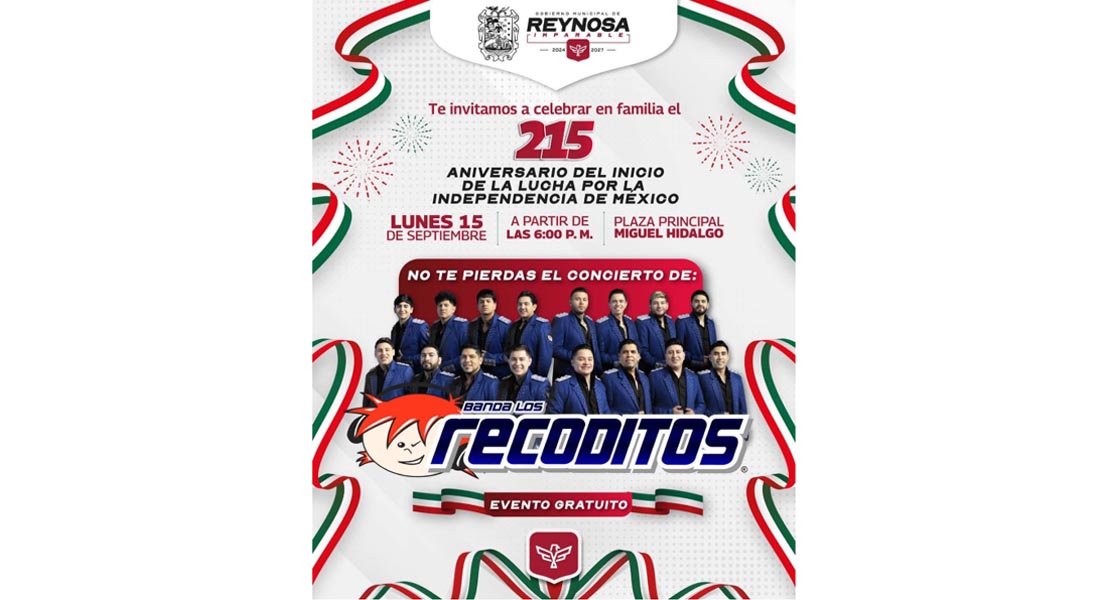 Reynosa, Tam.- La celebración de los 215 años del Inicio de la Lucha por la Independencia de México estará enmarcada con grandes estrellas, disfruta la gran noche del 15 de septiembre del estupendo show musical de la Banda Los Recoditos.
