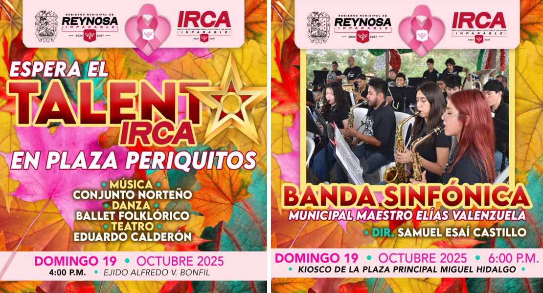 Reynosa, Tam.- Siguiendo las instrucciones del Alcalde Carlos Peña Ortiz, el Instituto Reynosense para la Cultura y las Artes invita a la comunidad a disfrutar de los eventos artísticos gratuitos que se llevarán a cabo este domingo 19 de octubre.