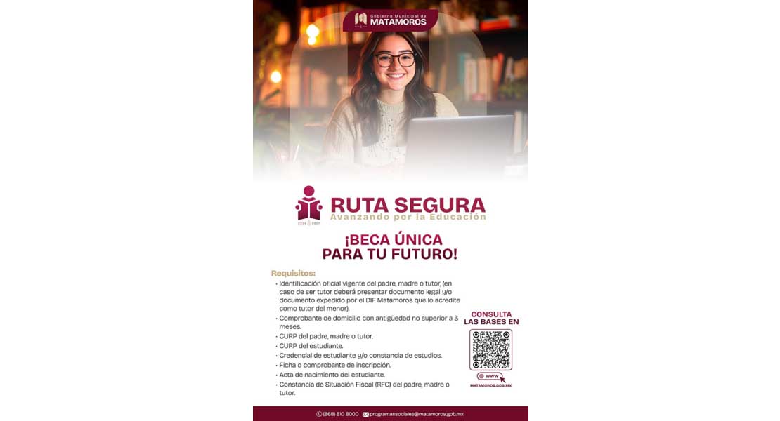 H. Matamoros, Tamaulipas.- Con el objetivo de apoyar la continuidad educativa y garantizar condiciones seguras para estudiantes de todos los niveles, el Gobierno Municipal promueve la iniciativa Beca Única, Ruta Segura. Este programa busca brindar apoyo económico a estudiantes en situación de vulnerabilidad, así como garantizar su traslado seguro hacia y desde los centros educativos.