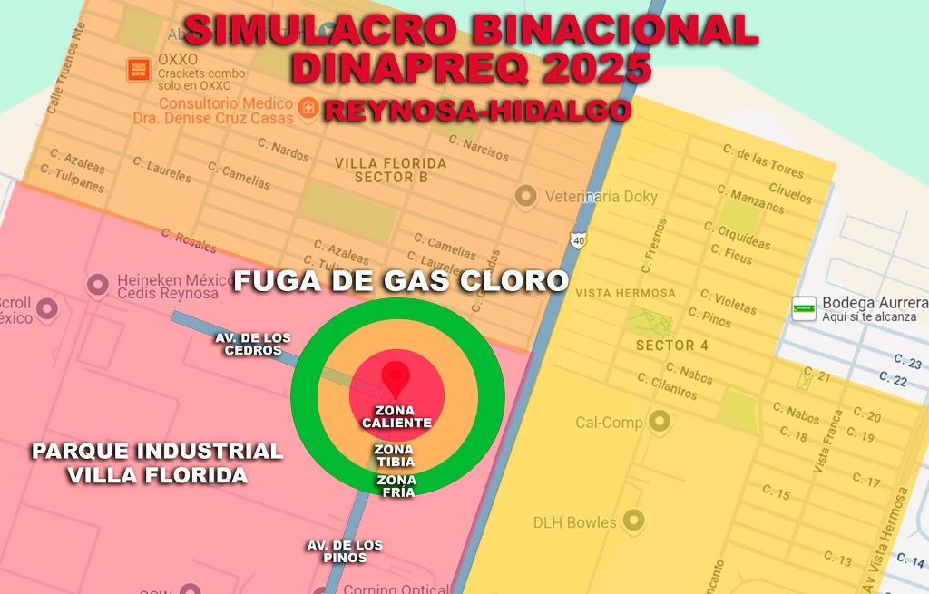 Reynosa, Tam.- El Gobierno del Alcalde Carlos Peña Ortiz informa a la población en general, que autoridades de Reynosa, Tamaulipas y de Hidalgo, Texas, llevarán a cabo el Simulacro Binacional DINAPREQ 2025, a partir de las 8:00 de la mañana en el parque industrial Villa Florida, este viernes 18 de julio.