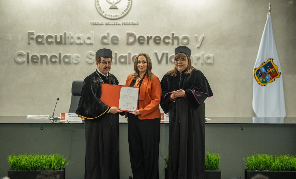 Ciudad Victoria, Tam.- En el marco de la Asamblea Solemne de la Universidad Autónoma de Tamaulipas, el rector Dámaso Anaya Alvarado entregó el nombramiento como presidenta honoraria de Familia UAT, a la Lic. Isolda Rendón Monterrey, destacando su liderazgo en iniciativas que fortalecen la unidad y el bienestar de la comunidad universitaria.