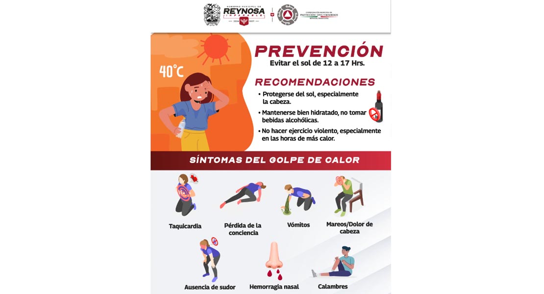 Reynosa, Tam.- El Gobierno que preside el Alcalde Carlos Peña Ortiz te invita a tomas medidas para evitar la insolación, conocida también como golpe de calor, que puede identificarse a tiempo con sus síntomas principales.