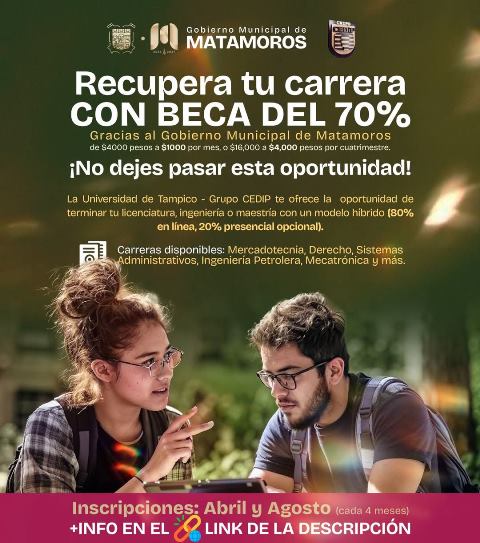 El presidente municipal, Beto Granados dijo que es la Universidad de Tampico, grupo CEDIP, quien ofrece la oportunidad de terminar una licenciatura, ingeniería o maestría, con un modelo híbrido, que es 80 por ciento en linea y 20 por ciento presencial, lo cual es opcional.