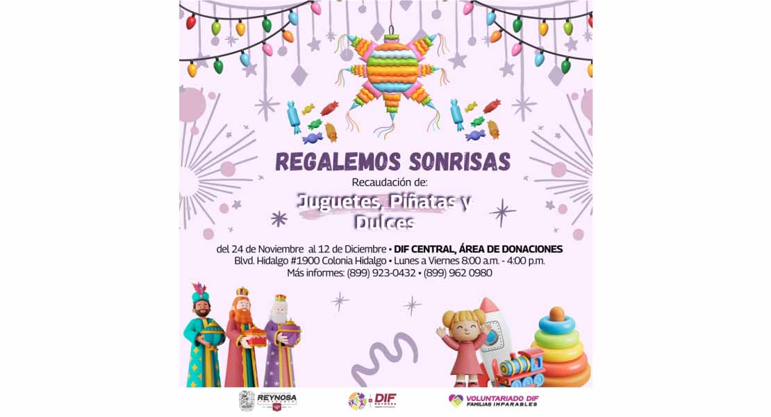Reynosa, Tam.- El Alcalde Carlos Peña Ortiz te invita a colaborar en la recaudación de Juguetes, Piñatas y Dulces, los cuales se harán llegar a los niños en condición vulnerable mediante la campaña del Voluntariado DIF que preside Alejandra Yelitza Garza, “Regalemos Sonrisas”, que recibirá sus donativos hasta el día 12 de diciembre en el DIF Central, ubicado en bulevar Hidalgo # 1900 de la colonia Hidalgo.