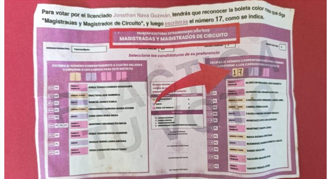 En algunos “acordeones” que se dieron a conocer promocionan a Jonathan Nava Guzmán, candidato a magistrado de Circuito en materias administrativa y Civil (cargo federal) y en el que se explica paso por paso cómo votar por su candidatura.
