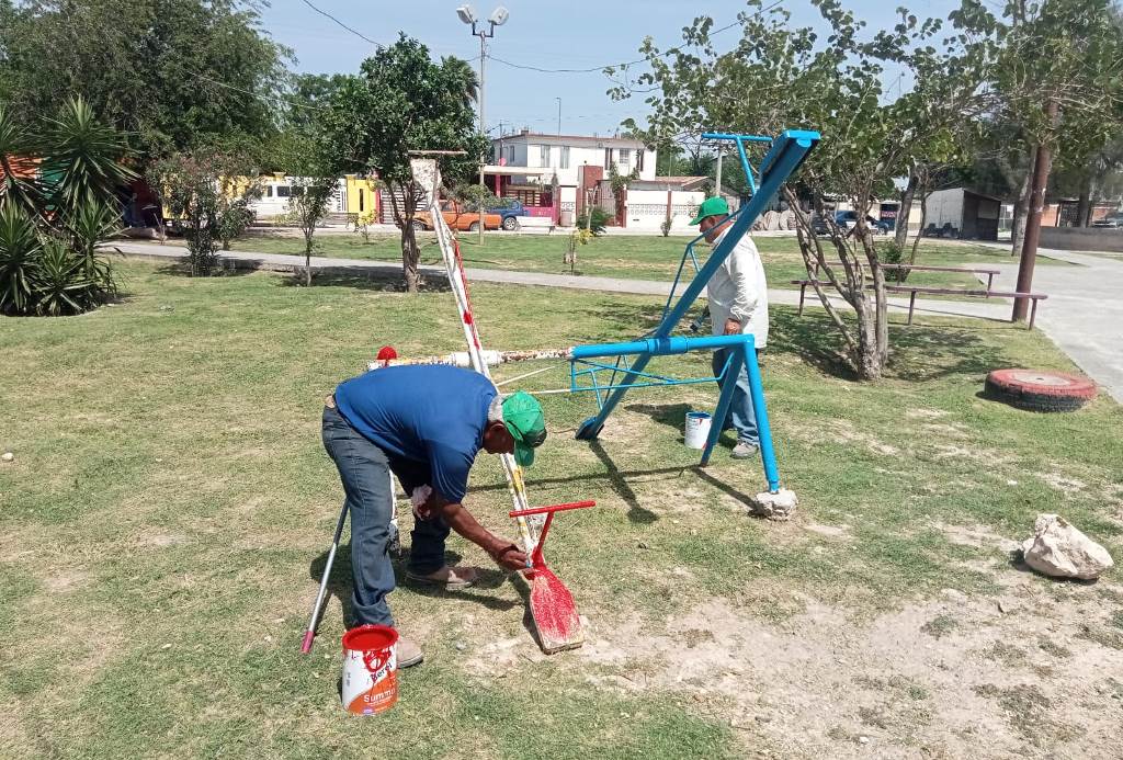 Reynosa, Tam.- Por indicaciones del Presidente Municipal Carlos Peña Ortiz, se llevaron a cabo trabajos de pintura para restaurar y mejorar la imagen de instalaciones urbanas de uso común, como los juegos infantiles y bancas metálicas en la plaza pública de la colonia Fidel Velázquez por la calle Azucena.